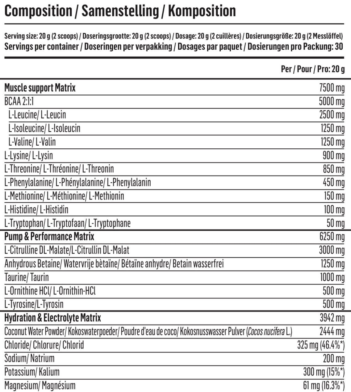 - 7,5 g EAA's , inclusief BCAA's in een verhouding van 2:1:1.